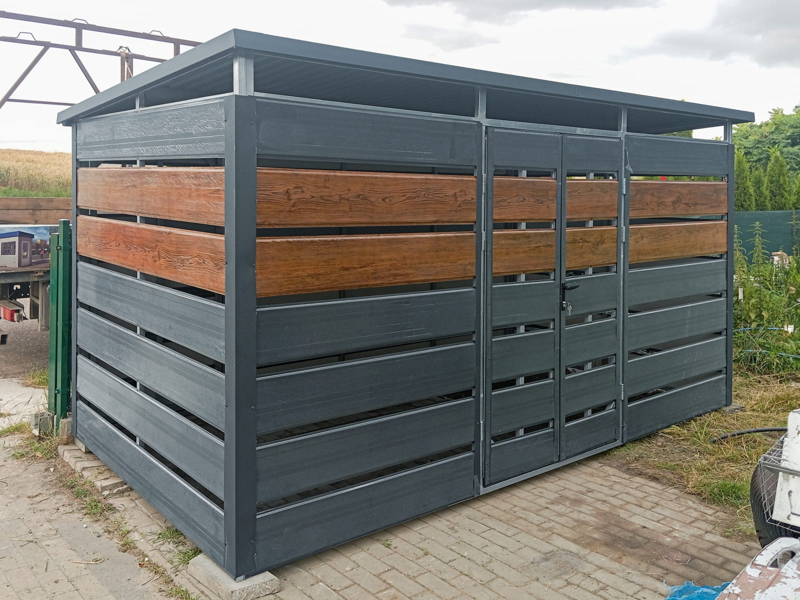 Wiata śmietnikowa 4x2m | Matowy grafit + Orzech + rynny