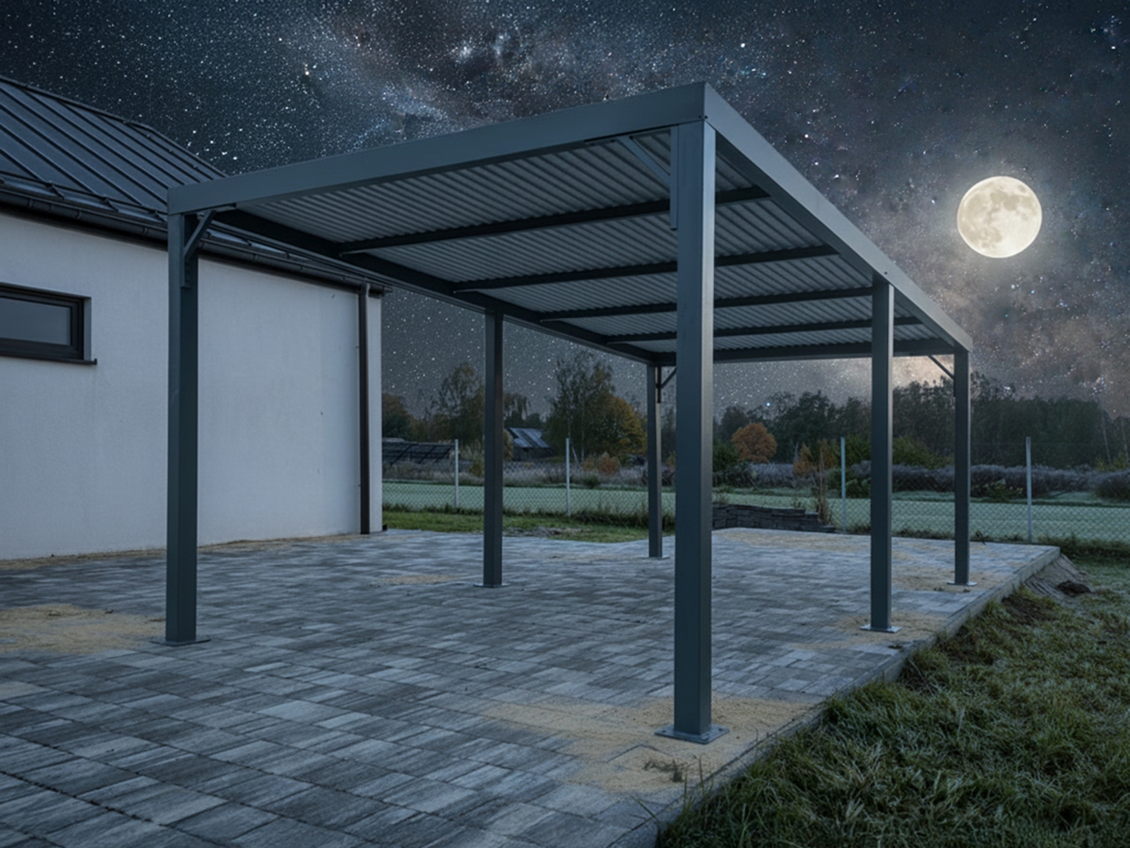 Nowoczesna wiata garażowa typu Carport o wymiarach 3x6m i otwartej strukturze. Zaprojektowana na jednej pojazd z dodatkową przestrzenią pod zadaszeniem.