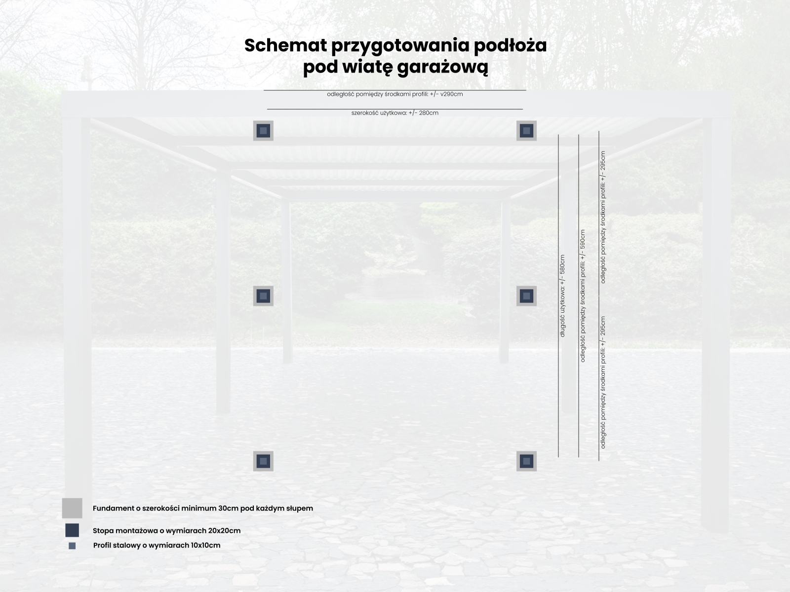 Montaż wiaty samochodowej odbywa się przez naszych montażystów na przygotowanym przez państwa podłożu.